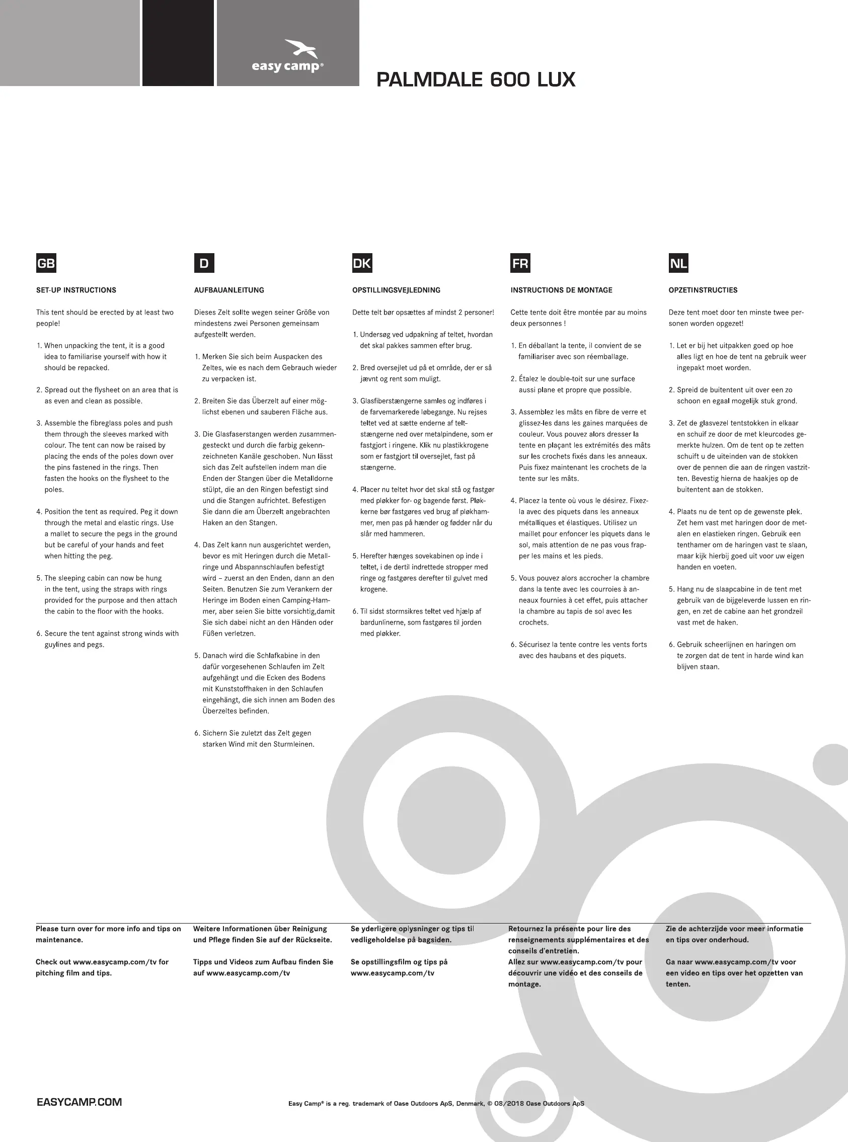 Læs gratis den danske manual til Easy Camp Palmdale 600 Lux (2 sider) i kategorien Telte. Denne vejledning er vurderet som hjælpsom af 17 personer og har en gennemsnitlig bedømmelse på 4.8 stjerner ud af 9 anmeldelser.