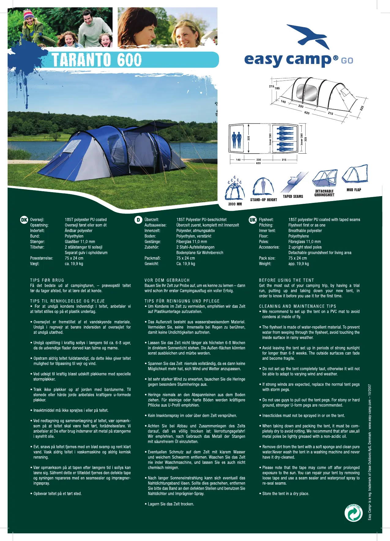 Læs gratis den danske manual til Easy Camp Taranto 600 (2 sider) i kategorien Telte. Denne vejledning er vurderet som hjælpsom af 14 personer og har en gennemsnitlig bedømmelse på 4.6 stjerner ud af 7.5 anmeldelser.