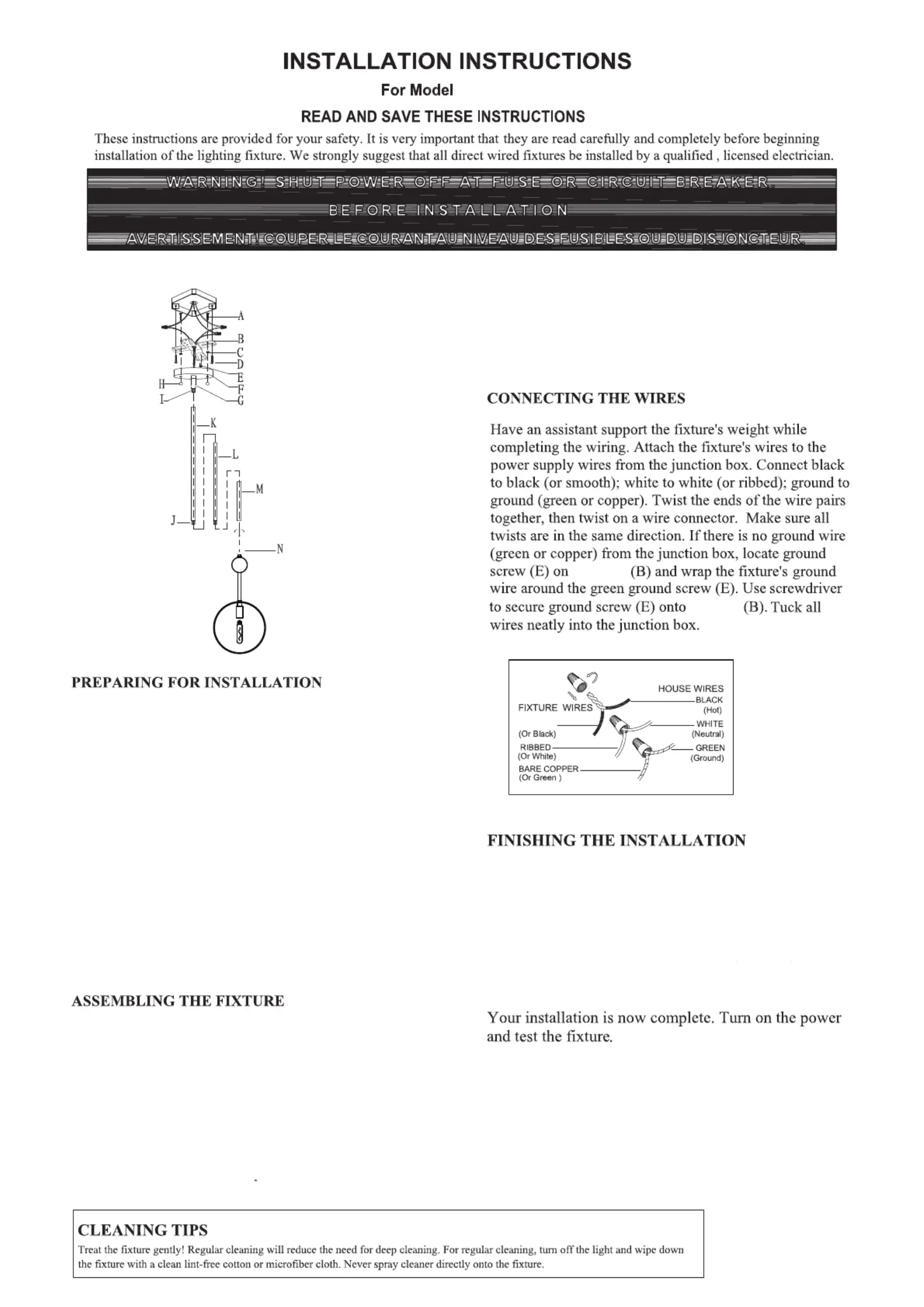 Install light bulbs (not included) in accordance with the fixture’s