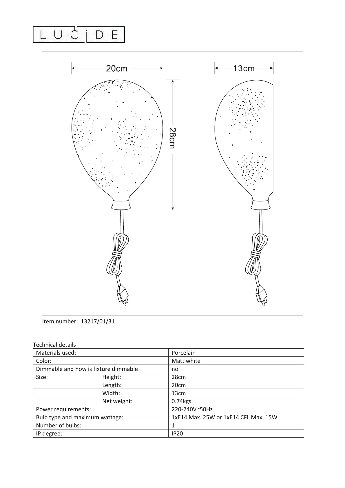 Læs gratis den danske manual til Lucide Balloon (3 sider) i kategorien Lys. Denne vejledning er vurderet som hjælpsom af 5 personer og har en gennemsnitlig bedømmelse på 5.0 stjerner ud af 3 anmeldelser.