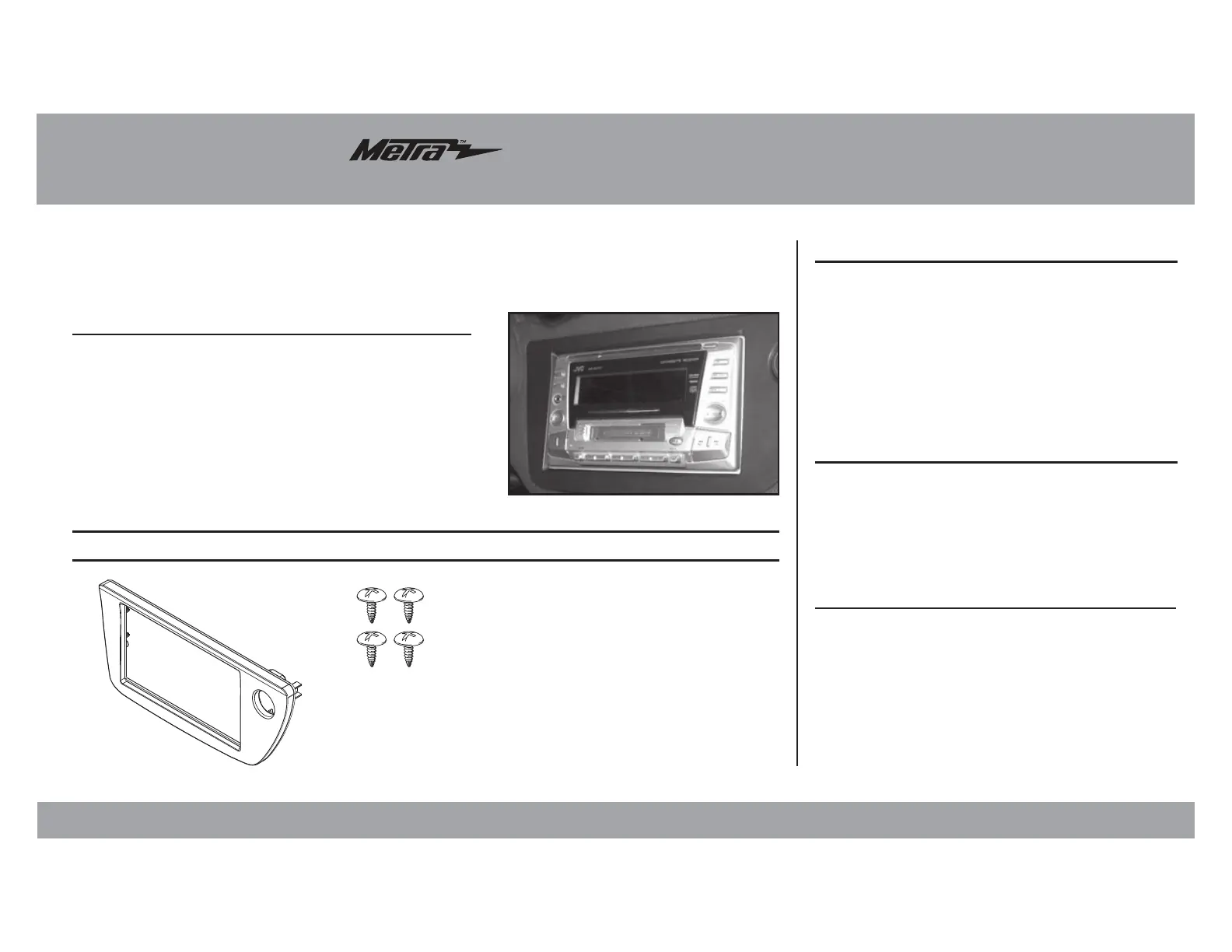 Læs gratis den danske manual til Metra 95-7867 (4 sider) i kategorien Ikke kategoriseret. Denne vejledning er vurderet som hjælpsom af 10 personer og har en gennemsnitlig bedømmelse på 4.4 stjerner ud af 5.5 anmeldelser.