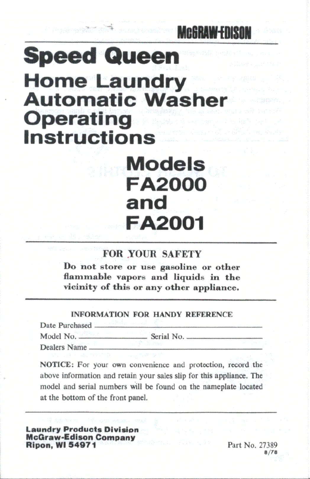 Speed Queen FA2001 Manual