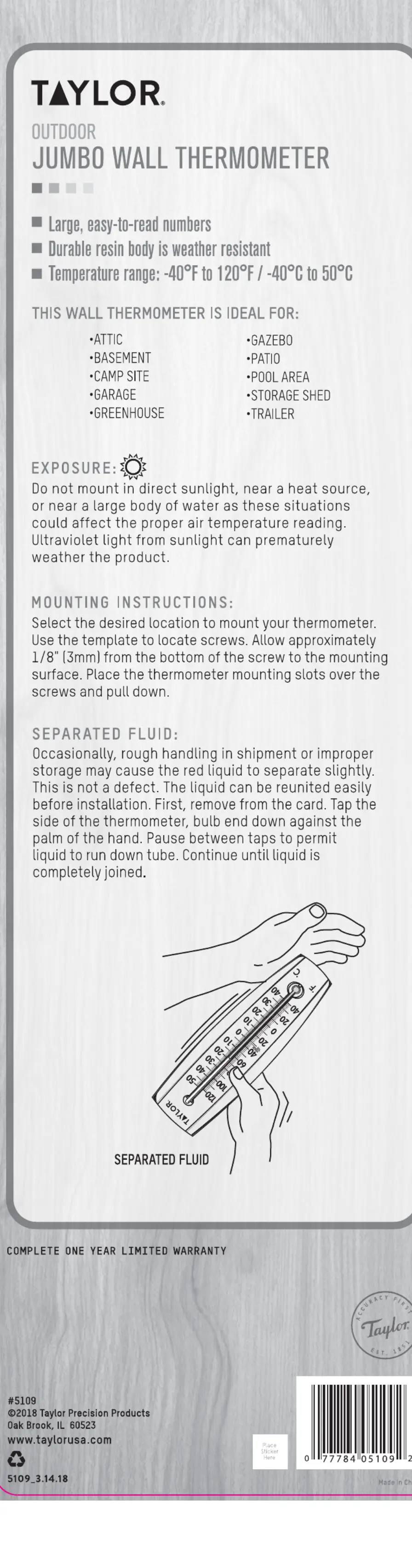 Læs gratis den danske manual til Taylor 5109 (1 sider) i kategorien Termometer. Denne vejledning er vurderet som hjælpsom af 19 personer og har en gennemsnitlig bedømmelse på 4.4 stjerner ud af 10 anmeldelser.