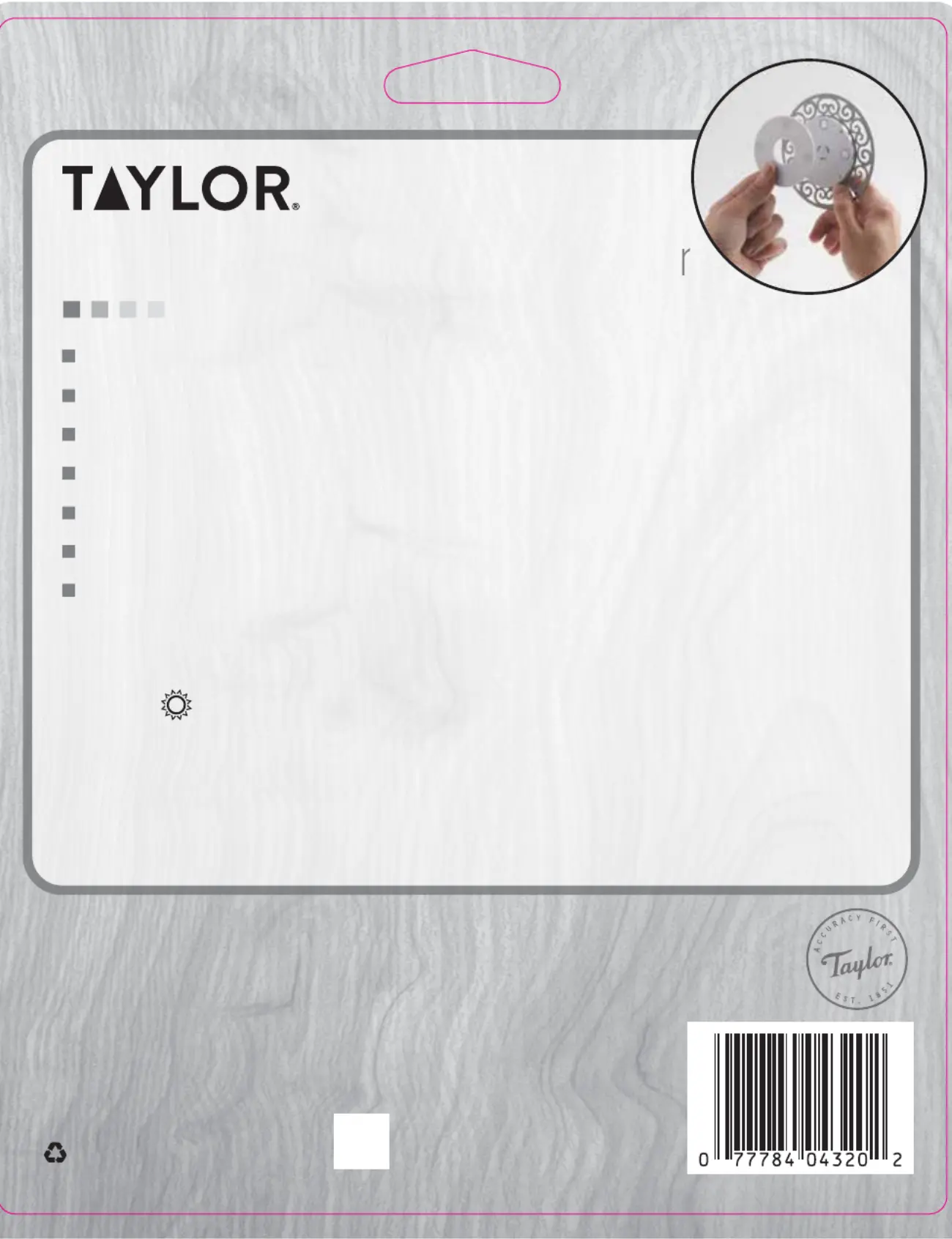 Læs gratis den danske manual til Taylor 5297675 (1 sider) i kategorien Termometer. Denne vejledning er vurderet som hjælpsom af 7 personer og har en gennemsnitlig bedømmelse på 5.0 stjerner ud af 4 anmeldelser.