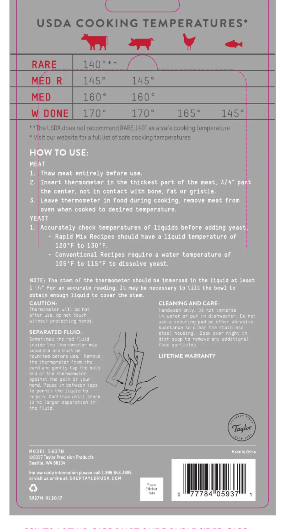 Læs gratis den danske manual til Taylor 5937N (1 sider) i kategorien Madtermometer. Denne vejledning er vurderet som hjælpsom af 36 personer og har en gennemsnitlig bedømmelse på 4.8 stjerner ud af 18.5 anmeldelser.
