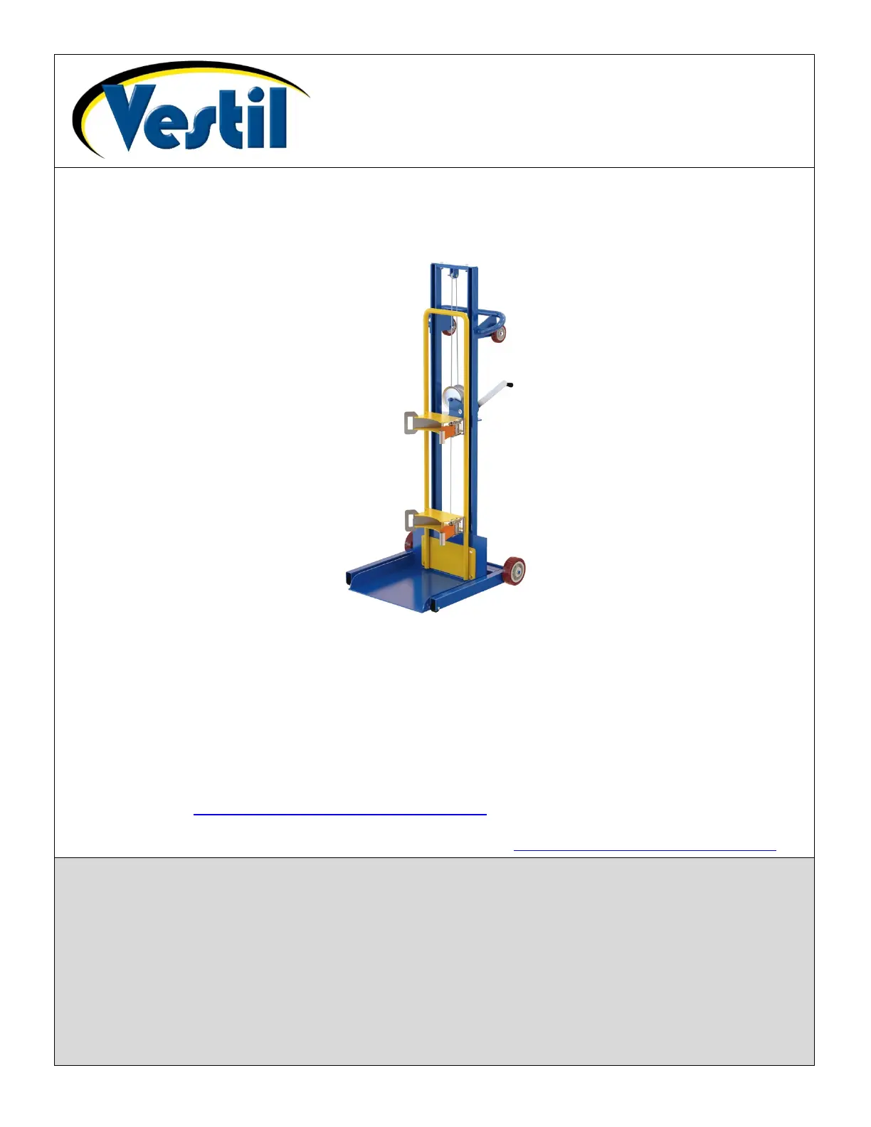 Additional copies of this instruction manual may be downloaded from https://www.vestil.com/page-manuals.php