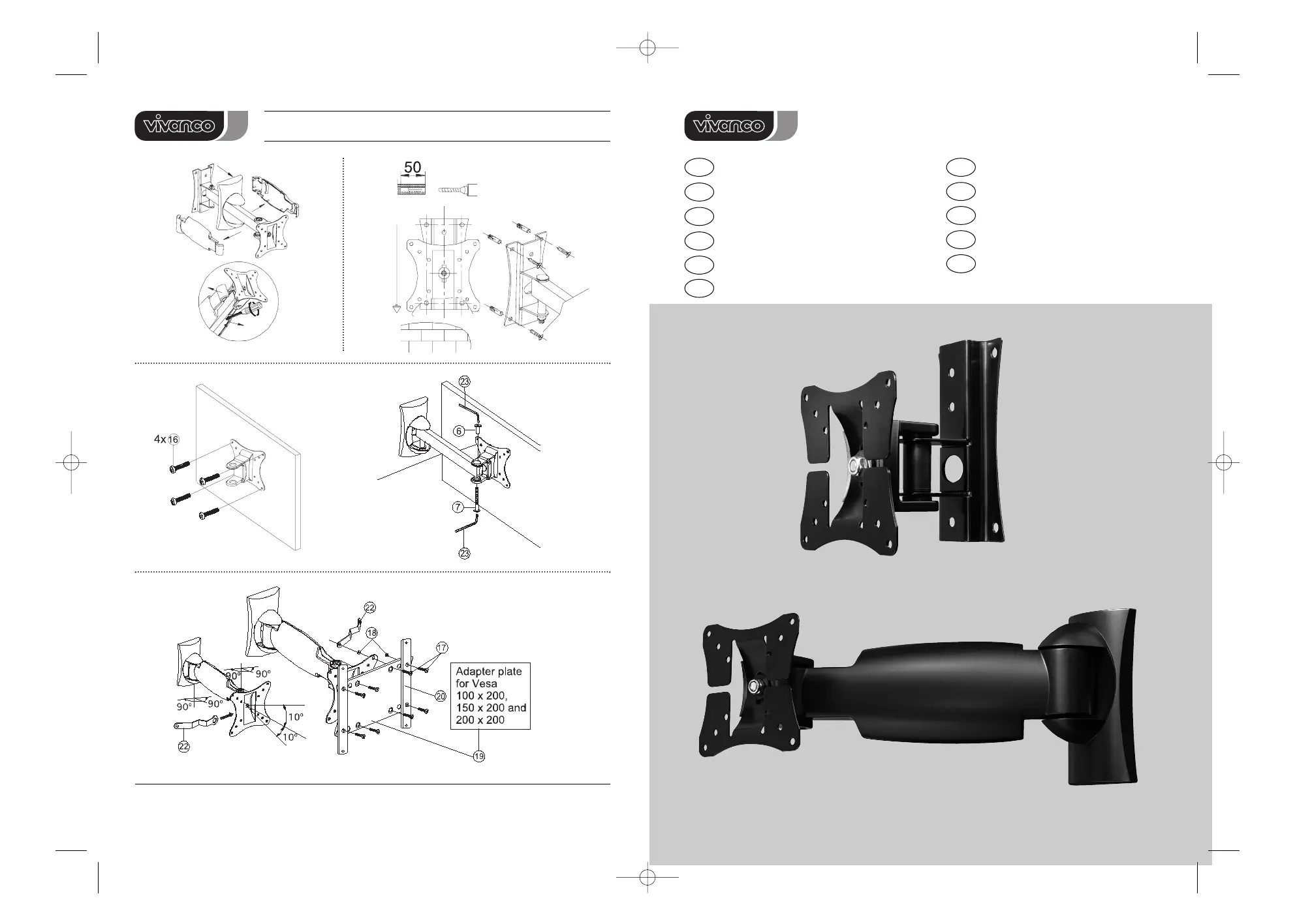 Læs gratis den danske manual til Vivanco WM 2210 (8 sider) i kategorien Wandstøtte. Denne vejledning er vurderet som hjælpsom af 20 personer og har en gennemsnitlig bedømmelse på 3.8 stjerner ud af 10.5 anmeldelser.